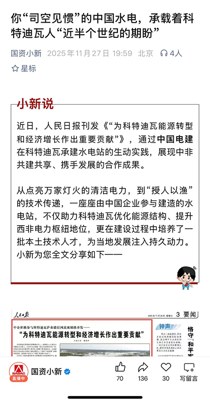 11月26日,《人民日报》3版要闻发表题为《中企积极参与科特迪瓦萨桑德拉河流域梯级开发——“为科特迪瓦能源转型和经济增长作出重要贡献”》文章,通过中国电建在科特迪瓦承建水电站的生动实践,展现中非共建共享、携手发展的合作成果。国务院国资委微信公众号、新浪网、环球网等媒体跟进转发,得到社会各界高度关注和广泛赞誉。 文章中,中国电建承建的格西波-波波里水电站形象照片刊登在版面醒目位置,内容主要聚焦中国电建积极参与科特迪瓦萨桑德拉河流域梯级开发,先后成功承建苏布雷水电站和格西波-波波里水电站,为改善当地能源结构,提供就业岗位并培养当地人才,推动科特迪瓦绿色转型,促进当地经济社会发展提供了重要助力。 在长期的项目执行和履约过程中,中国电建项目团队积极展现央企担当,主动履行社会责任,多次为当地义务修补道路,深入沿线社区捐献生活学习物资,赞助承办当地文体比赛,举办中科文化交流活动,与当地政府和居民建立了深厚情谊,赢得广泛认可和赞誉,实现了履约效益与品牌效益的双赢,成为新时期中科友好合作的生动写照。 | ||