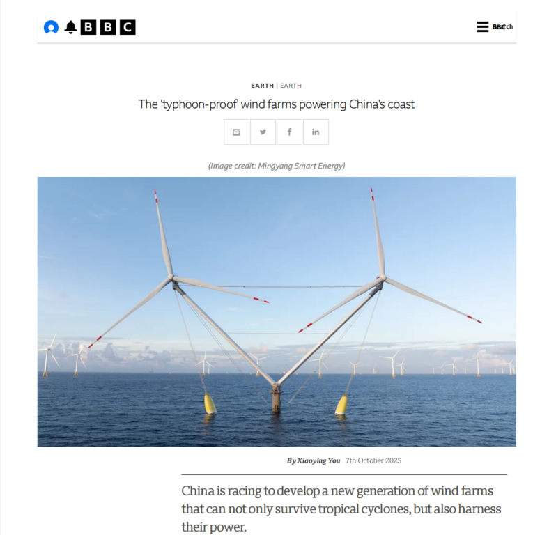 近日,BBC科技频道发布专题深度报道,称“明阳天成号”成为“抗台风”典范。 报道指出,每年5月至11月,源自西北太平洋的台风肆虐东亚和东南亚国家。中国主要企业通过综合策略提升了风机的抗灾能力,包括开发先进材料、增强气象预报能力以及升级风机控制系统。加州非营利组织全球能源监测机构(GEM)可再生能源研究员韩玉佳举例说明,“明阳天成号”便是典范。 今年肆虐中国南方的台风“桦加沙”是全球最强风暴,风速高达241公里/小时。当“桦加沙”经过时,在距离广东省阳江市海岸约70公里的海上风电场,中国电建所属贵州工程公司承担主要施工任务的全球单体容量最大的漂浮式风电平台——“明阳天成号”经受住了152公里/小时的最大风速考验。实际上,早在2024年9月,“明阳天成号”就接受了超强台风“摩羯”(17级)的猛烈冲击。接连迎战两次超强台风后,不仅安然无恙,还在风暴中持续发电,向世界展示了中国海上风电工程卓越抗台性能和匠心智造水平。 “明阳天成号”在一个漂浮式基座上布置有两个风力发电机,两座风机并肩而立 ,总容量达到16.6兆瓦,贵州工程公司承担了从基础处理到最终调试的多个关键环节,并以非凡的专业实力和卓越的应对能力,成功克服了任务繁重、工期紧迫、施工难度巨大以及环境恶劣等多重困难,高标准、严要求,优质高效地完成了“明阳天成号”施工任务。 该项目已于2024年12月正式投运,预计每年可提供约5400万度绿色电力,能满足3万户三口之家一年的日常用电需求。该项目通过利用先进的漂浮式风电技术,能够在水深超过35米的海域中稳定运行,极大地拓展了风电产业的发展空间,为我国乃至全球的海上风电发展提供了宝贵的施工经验和技术参考,也为海洋能源技术的突破,推动行业创新做出了积极贡献。 | ||